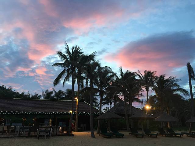 厚厚的云层正在努力散去,站在海边向酒店看去椰子树、绿屋顶,即便是阴天也算是一副漂亮的画面吧