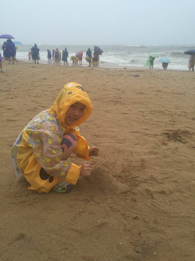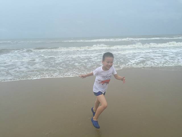 小朋友第一次见海,淋着雨,鸡冻的啊,奔跑中的小小少年啊!!!!!