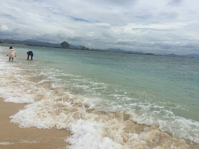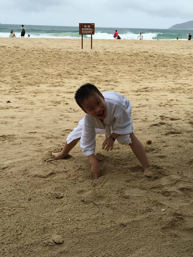 出发前一直在关注天气,到达第一天三亚下起了小雨,但是依然不能阻挡看海的热情,小朋友心急如焚,办理了入住手续后,冒着雨冲向海边撒欢一阵。