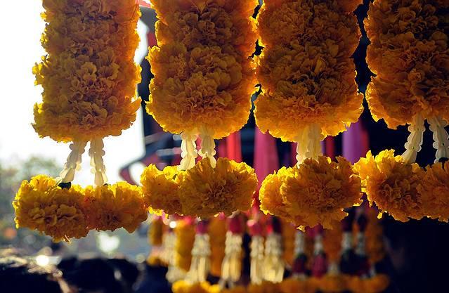 这里还有清迈24小时不打烊的花果市场,全天候供应各式花卉水果蔬菜干货。这里的鲜花应该是最幸福的花卉吧,一打一打,一摞一摞,泛着清晨的露珠,扎成花环花塔花束花篮,流入各商贩手里,但最终,都将敬献与佛主跟前。