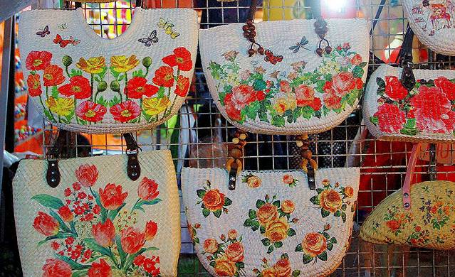 山区少数民族刺绣布袋、泰丝和棉织品、竹编制品、青瓷、银器、家具、漆器、木雕和手绘纸伞,还有光泽闪烁的铜器、手编草席、泰式乐器、黑金镶嵌品、蜡染布料、釉彩陶器以及竹编的篮子、藤器和竹器,泰国民族特有的衣服,首饰,化妆品,应有尽有。