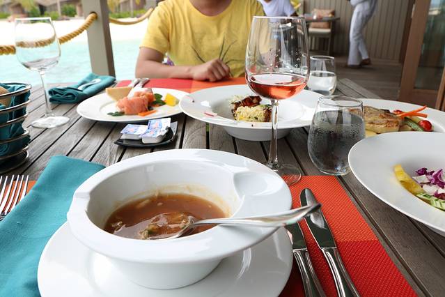 卡尼岛的午餐和晚餐都是自助餐,各类美食,吃不习惯还有中餐可以选择..自助餐种类多,味道好。翡诺岛的午餐也算是自助餐,不过大致8道左右可选,但是道道料理都很精致,口感很好,实属美味佳肴,晚餐是点餐式,种类比午餐的多几道,同样道道都很精致好吃。。还有那些甜点,好好吃!岛上都有酒吧,渴了想喝就喝,饮料种类繁多,酒精饮料,酒类,各式各样,根本停不下来,点心时间还有点心。。在这里就是任意吃任意喝。。随手就喝到一杯你喜欢的饮料。。这几天经常说的话是“好好吃啊"”好好喝啊“....各种美食。。