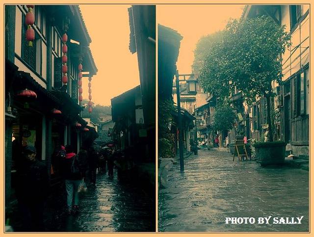 百度上说:古镇磁器口有12条街巷,街道两旁大多是明清风格的建筑,地面由石板铺成,沿街店铺林立。