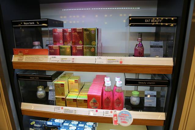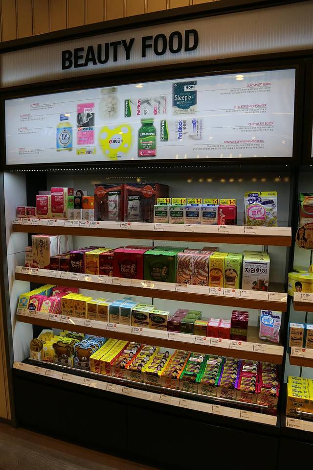 跟着这位店员大姐姐,我俩上了2楼。看照片各位看出点什么不?2层有卖吃的专区!为啥化妆品店卖吃的啊……一抬头上面写着 Beauty Food!美容食品!哇,听说韩国美女们原来为了美丽连饮食都注重,亲眼看到还是吃惊了一下下!真是令本姑娘叹服不已~