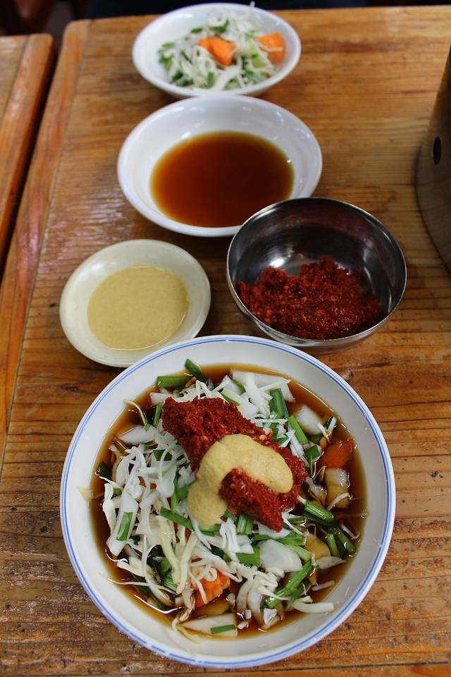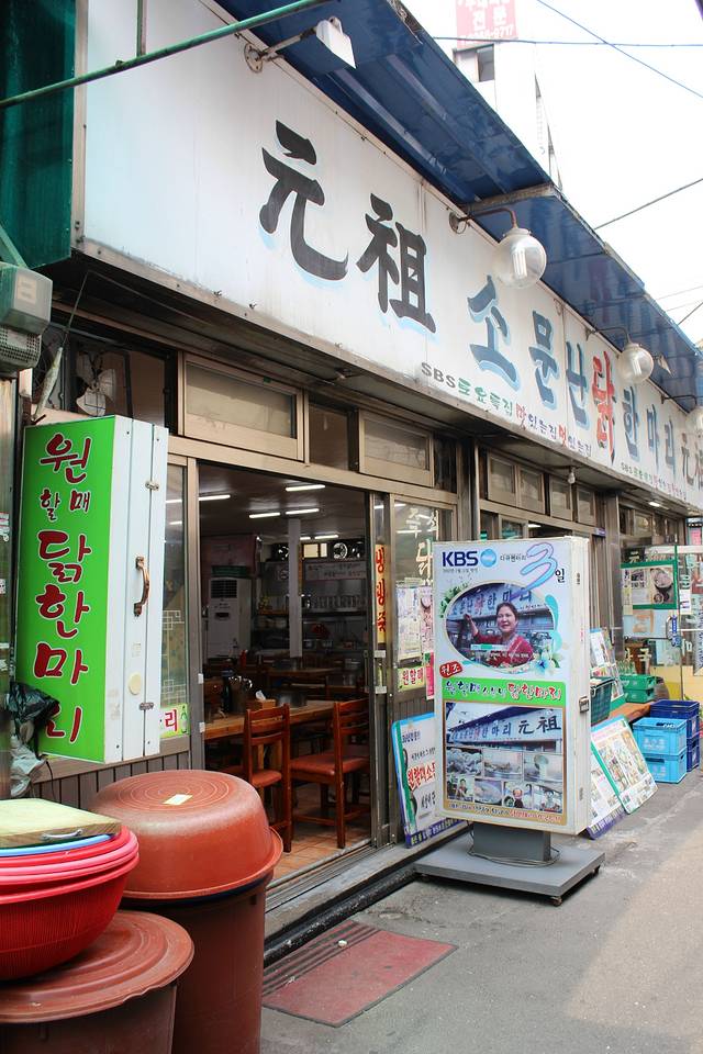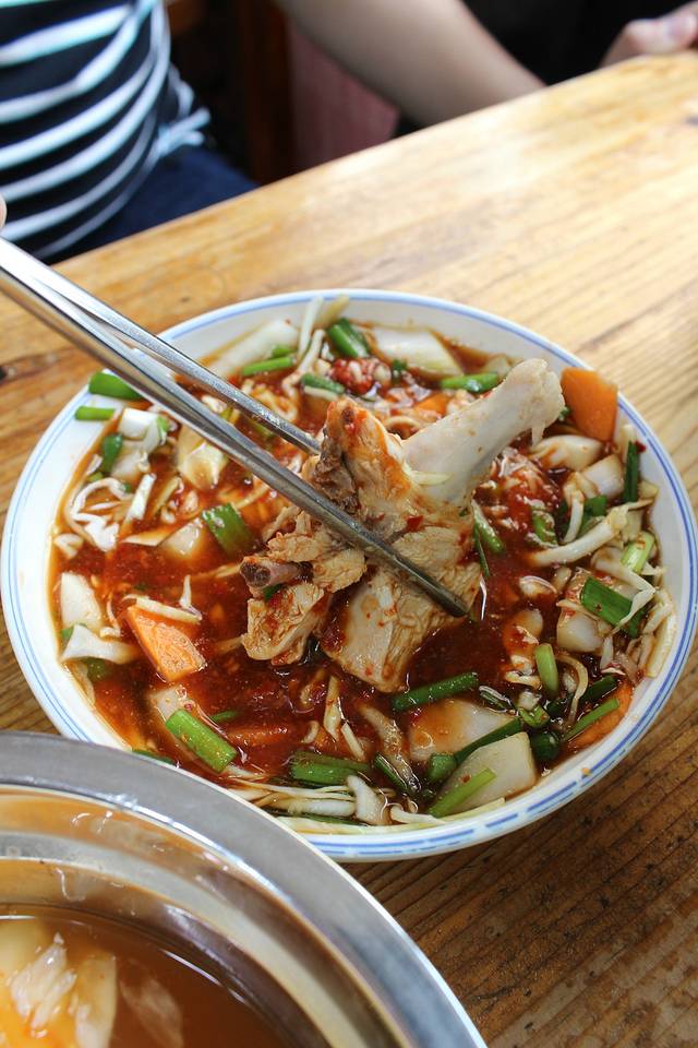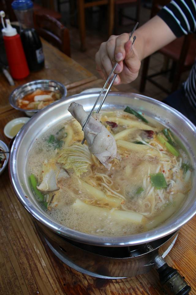 “一只鸡”有点像火锅,里面肉汁加上鸡块,面条,年糕,还有蔬菜,一起煮熟了之后蘸酱吃!其实超美味!我俩互相也不说话,低头猛吃!哈哈哈哈现在想想太可爱……价格是两个人2万5千韩元!