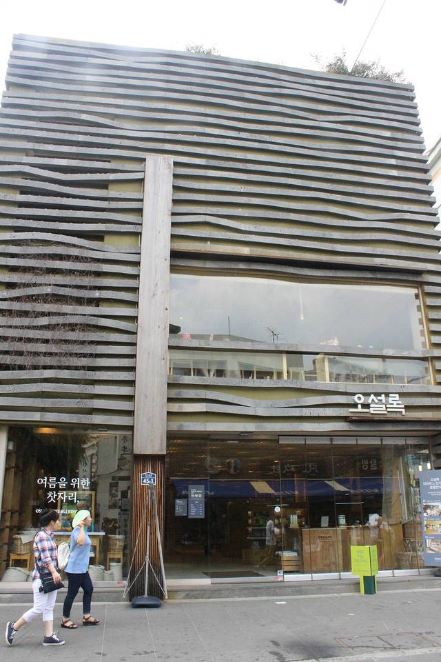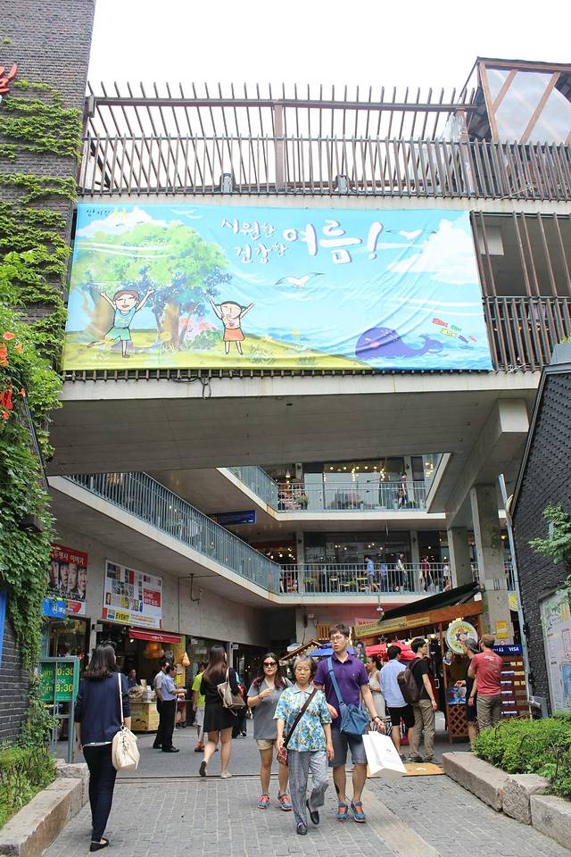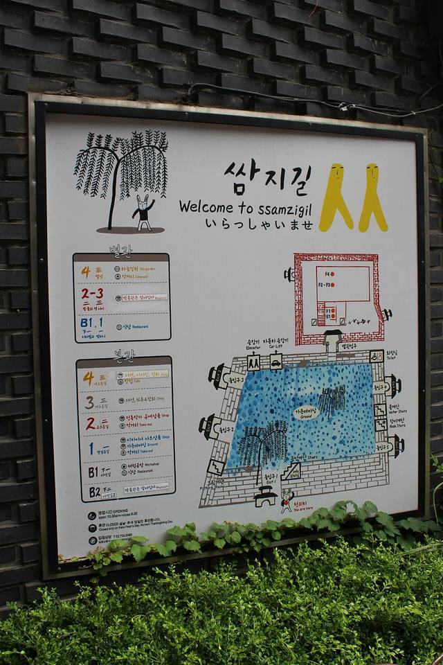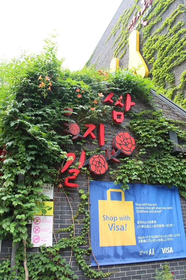 这就是仁寺洞Ssamziegil的入口啦~距离旅馆不远,我俩走着就到了~正是夏天,各种绿色的植物盖满了墙面~墙上这个像“从”一样的汉字呢,就是Ssamziegil中出现的韩国字啦,就像logo一样,是不是超有意思~