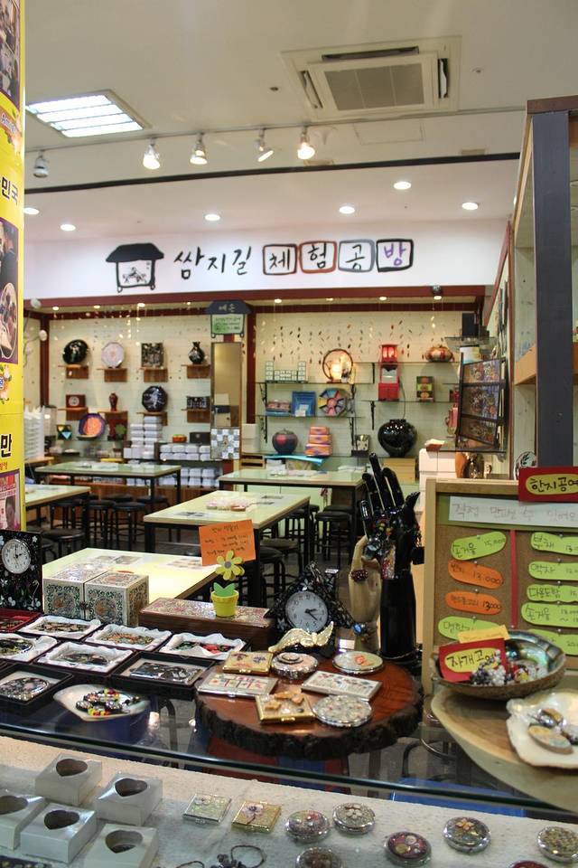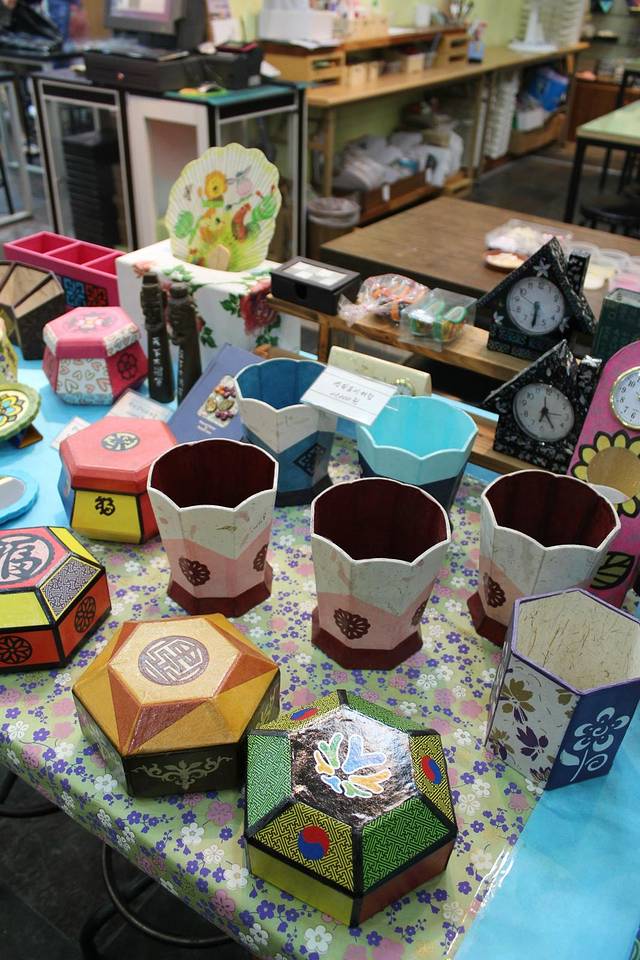 这里说是制作韩国传统工艺品的工坊哦~也能制作小手镜,也能做首饰匣之类的小东西~都是用韩国传统的韩纸制作的哦,像我这种手比脚还笨的人啊,真的是想都想不到的点子!我就看看得了哈,体验什么的下次再来吧~看了一会肚子就抗议了~早上也没吃什么东西,第一顿韩餐吃的什么呢?