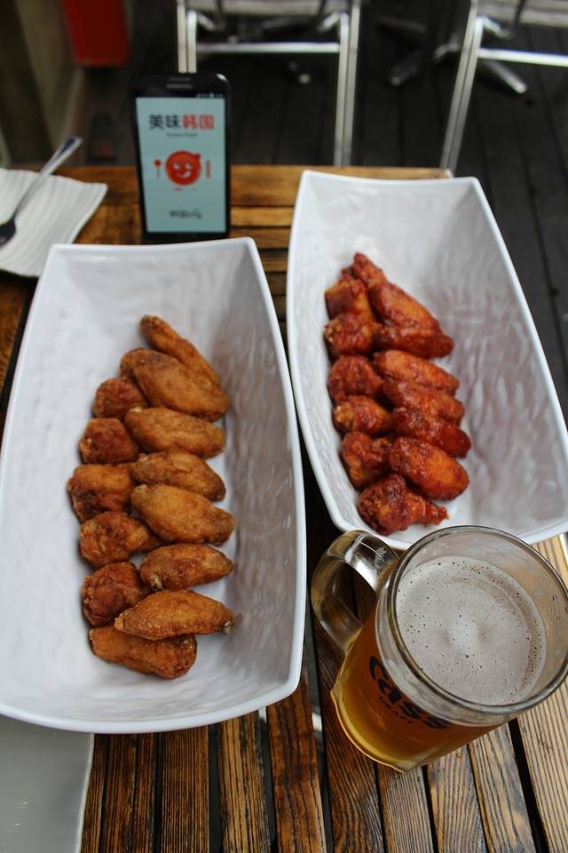 看起来是不是超好吃?点的是调料炸鸡和酱油炸鸡!还有冰凉清爽的啤酒啦!大家都因为“星你”知道炸鸡和啤酒的吧?哈哈,我终于在韩国吃到正宗的啦~感动呢!确实是比中国的要好吃呢!是不是“炸鸡之鼻祖”在这里的原因呢……