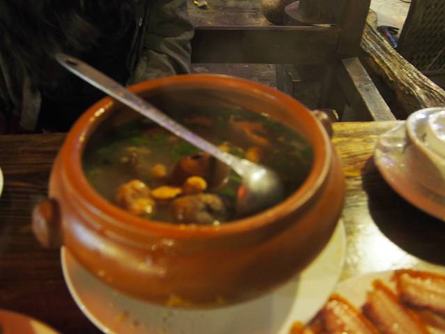 这张拍糊了,汽锅鸡,没什么感觉,就是鸡汤。这顿饭吃了一百出头,三道菜还有饭和茶位。不过这里有驻唱歌手,所以价钱还是中规中矩吧。
