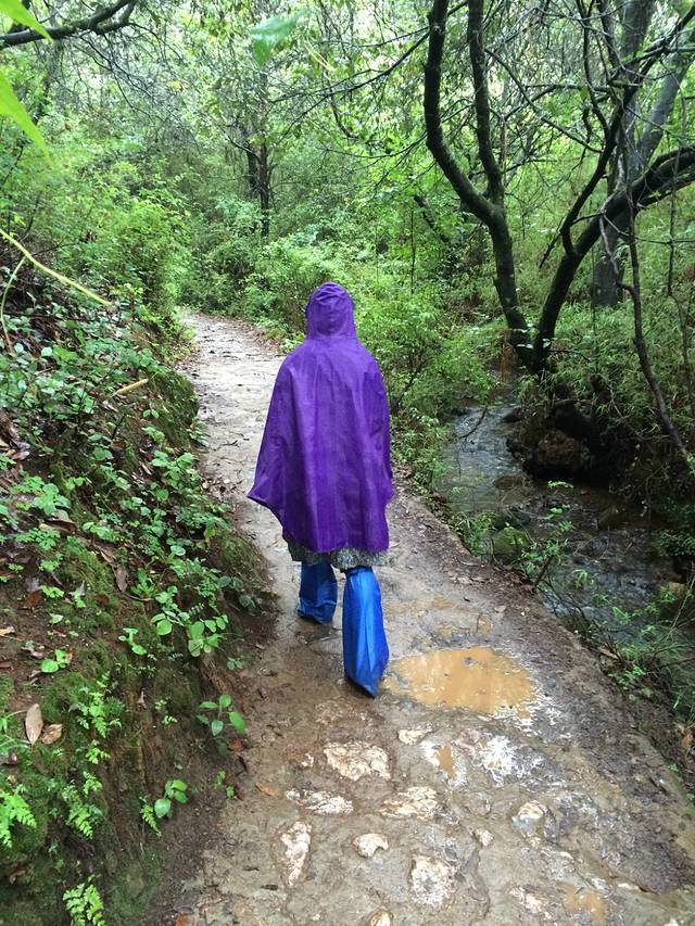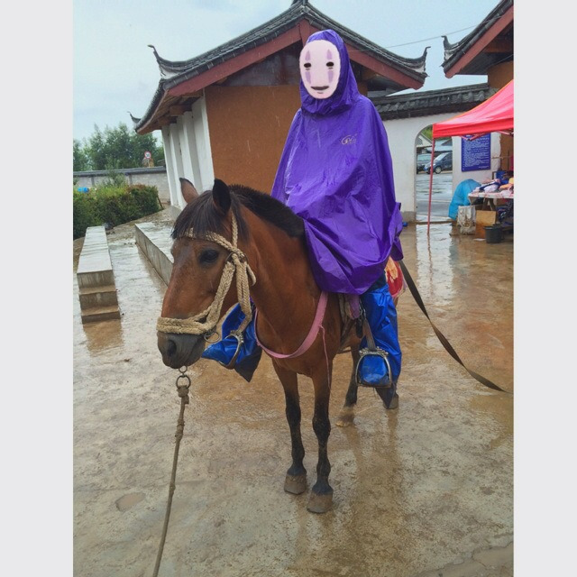 那天也在下小雨,到了之后选了骑马的线路,但告诉我们学生证没有半价,因为马是农民自己的。但给我们降了一百块钱,但还是几百块啦!!!感觉一下子花了笔大钱。走的线路好像是a5,挺不错的。雨衣是免费的,但鞋套要给钱,建议下雨的话还是买吧,可以砍下价。然后,我们上马了嘿嘿。看上去不高的马骑上去一开始还是有点害怕的。