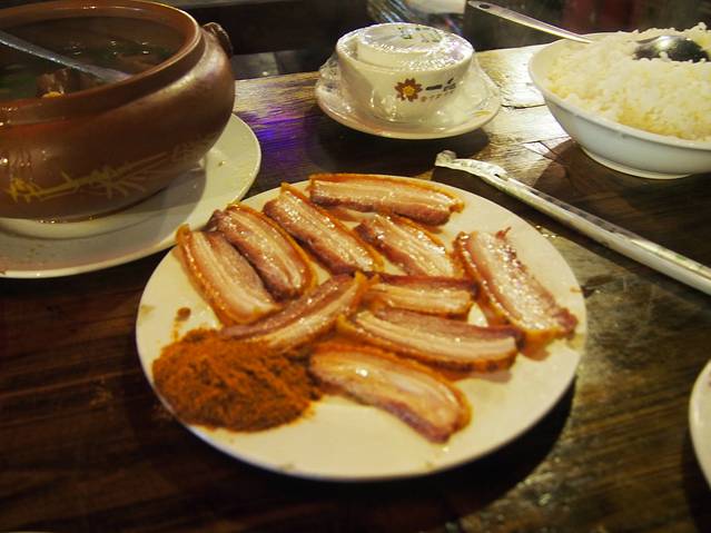 纳西烤肉,旁边是孜然粉,还是因为饿了,觉得这个挺好吃的,跟广东的烧肉差不多但薄很多所以不会那么腻。