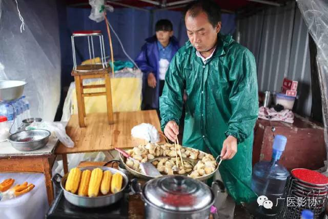 风夹杂着雨打向我们,当时我就和后座的师兄说 我第一次知道什么叫冷冷的冰雨在脸上胡乱地拍。。。我们骑了一路雨都没停过 还特别大的雨滴 打在脸上真是啪啪响 不过淋着雨开车我好像很亢奋 也算得上意外的经历了吧 图为路边小摊 吃了玉米和炸洋芋压压惊 当时真的冷到下车都在抖