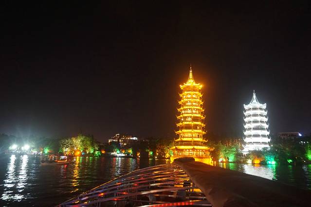 【其他】晚上游湖的感觉不错,主要是两岸灯光布置的景色。站在甲板上拍两岸景色很过瘾,呵呵。桂林的桥设计很有特色,特别是桥洞壁还有少年宫孩纸画的画。