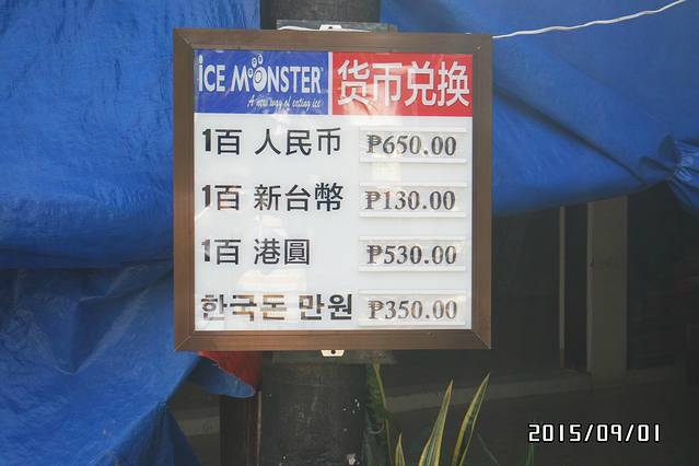 兑换了18000比索(折合人民币2600多元,最好国内换,国内1:6.8,岛上就1:6.5,甚至1:6!),美金1000元人民币1000元(有点多了,基本没用上,比索够了)。