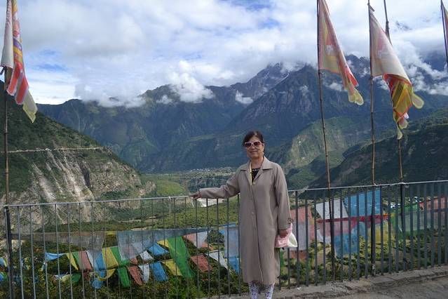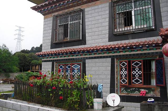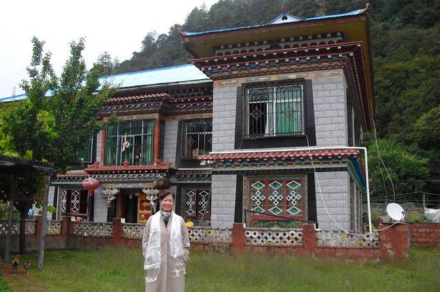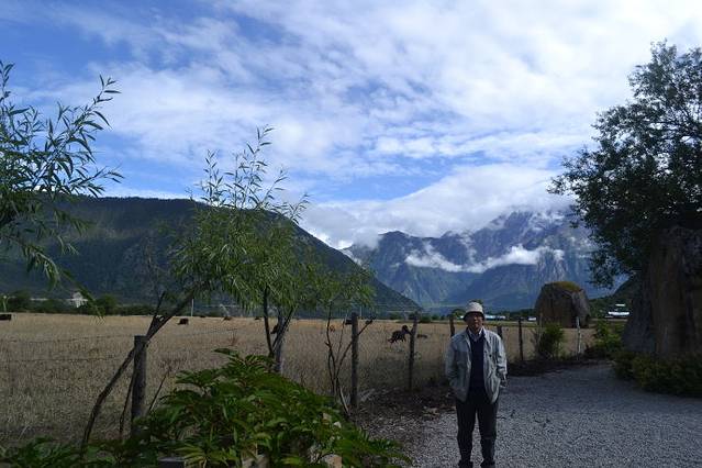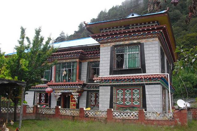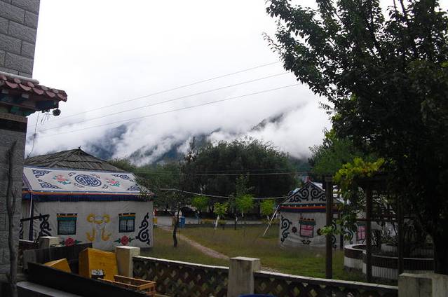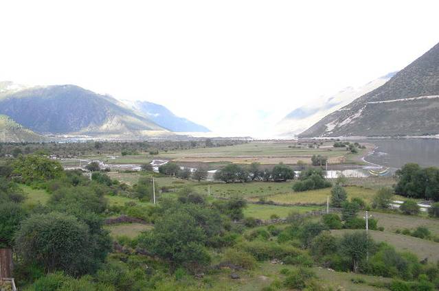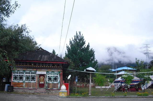 看完了表演。我们旅游团15个人由1个自称是共产党员的叫珠玛的青年妇女拉到她们家里做客。我看了看四周,小小的章巴村,景色真是不错。