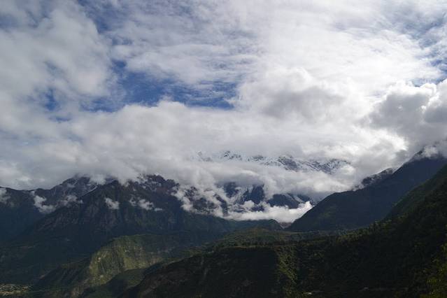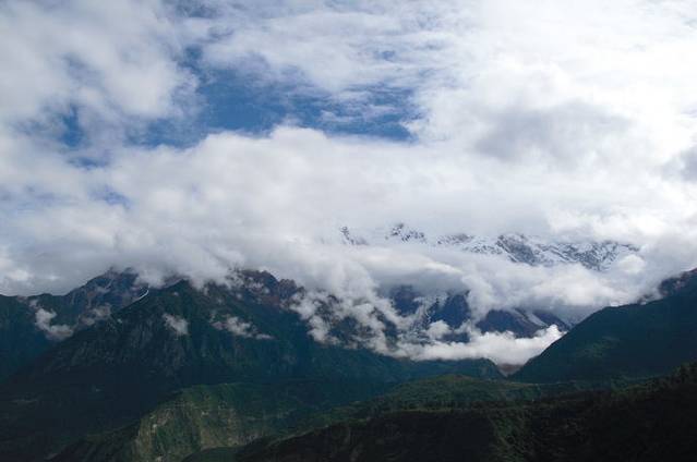 南迦巴瓦峰有9个山峰。我们觉得今天山上的云雾撩绕,肯定是看不得了。我给了司机1根香烟,问司机什么时候才能看到9个山峰。司机告诉我。只有到了冬天,气候干臊了,不下雨了,才能真正看到南迦巴瓦峰。其他的日子是看不到全部的。