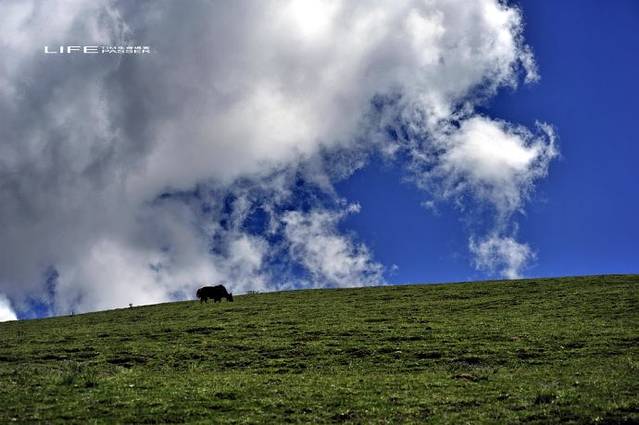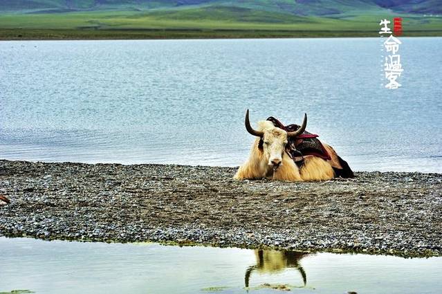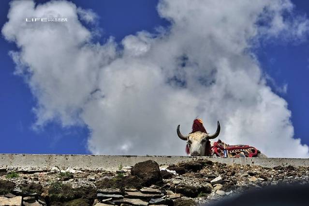 憨厚的白牦牛披着鲜艳的鞍座,圣洁凝重,仿佛是高原的使者。