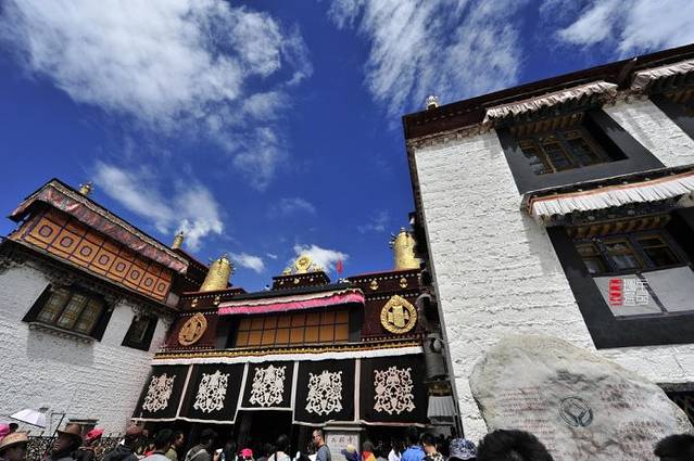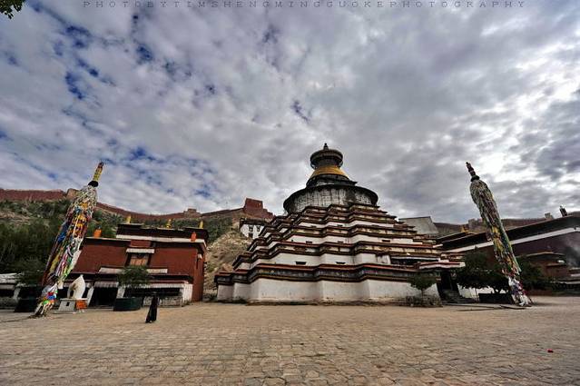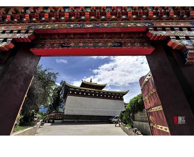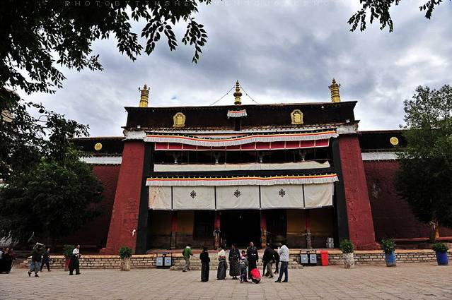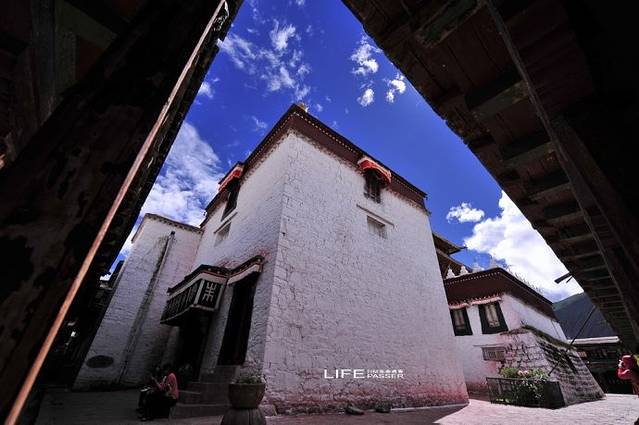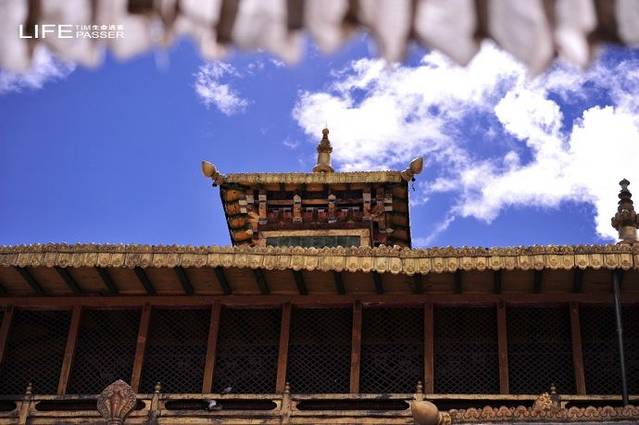 2、【白居寺】该寺建於14世纪未15世纪初,1390年(明洪武二十二年)帕巴贝之子贡嘎帕创建白居寺,修桑波仁波林佛殿。1414年其孙曲吉饶登衮桑帕和宗喀巴的弟子克珠杰(即一世班禅)建禅林,即“白阔曲登”。主体建筑为措钦大殿,共3层。大殿坐北朝南,呈十字形,底层为佛堂,有柱48根。北左壁的强巴佛铜像,有二层楼高。经堂北面的觉康正殿,宽5间,深3间,供奉有三世佛大铜像,两侧塑有十六罗汉,造像浑厚、荘重。经堂两侧为东西净土殿。东东净土殿中间龛供奉强巴佛像,像后东壁塑有千手千眼十一面大悲观音,造像高大荘严。西净土殿,殿中龛室供奉卢膨那佛像,四壁布列菩萨和供养天雕塑。两殿四周有壁书,人物婀娜多姿,形象逼真。