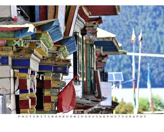 扎西岛沿湖,挂满了七彩的经幡,藏民们的祈福心愿无所不在。