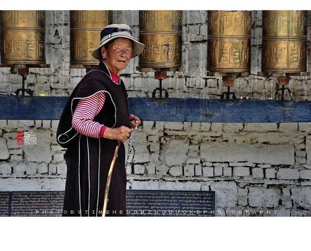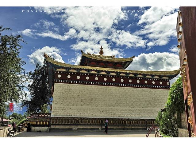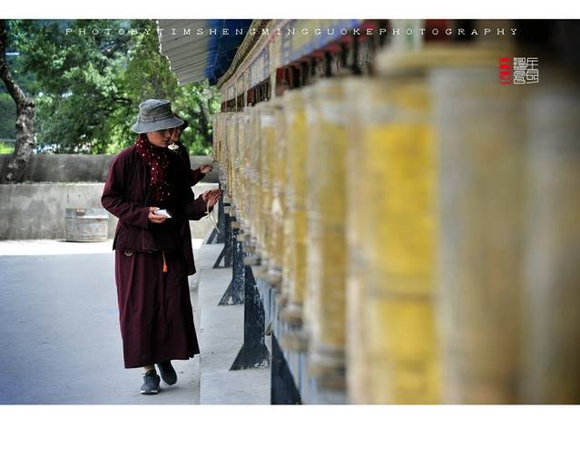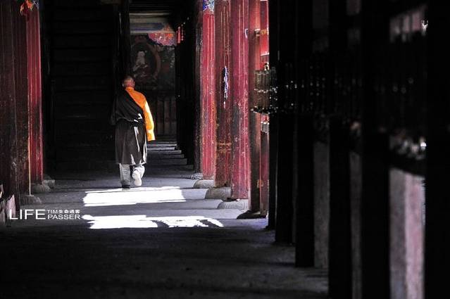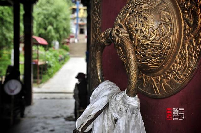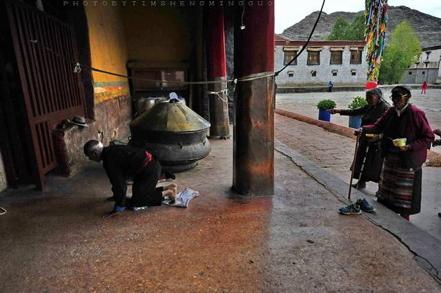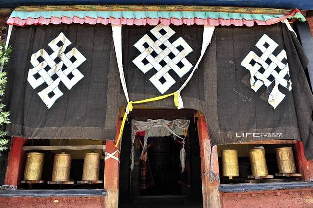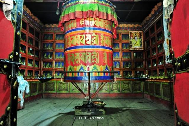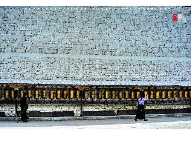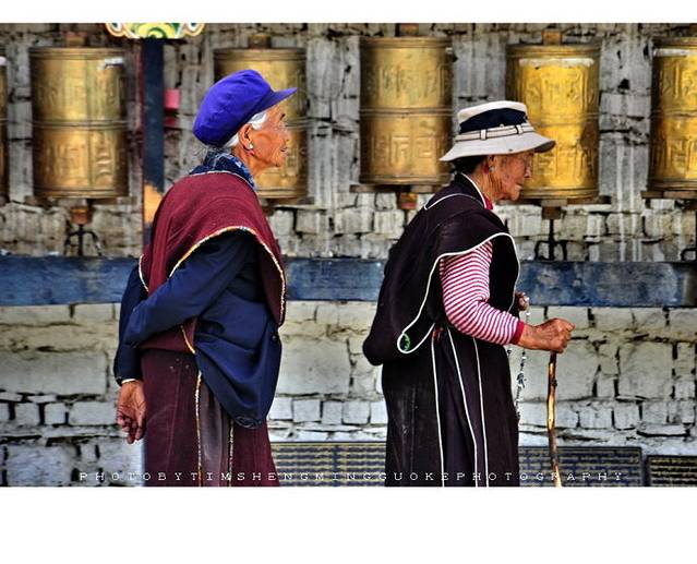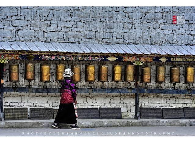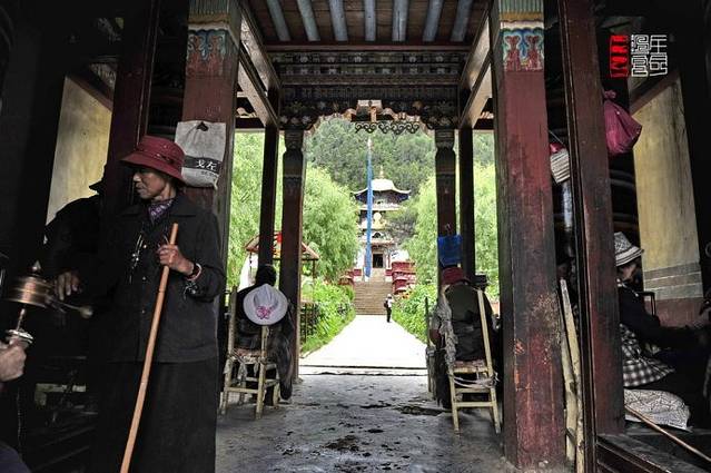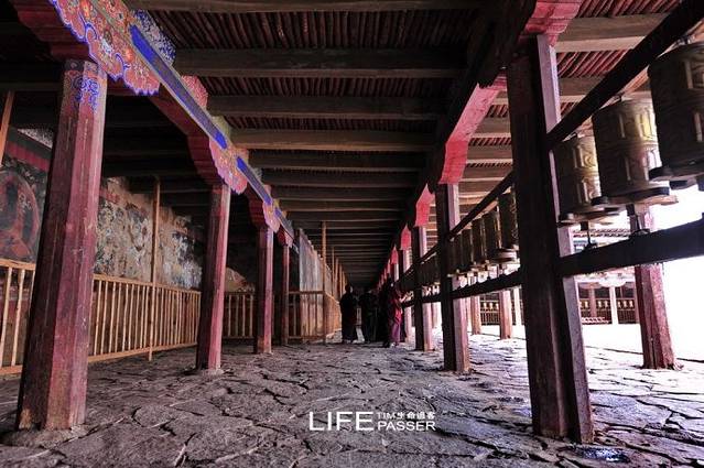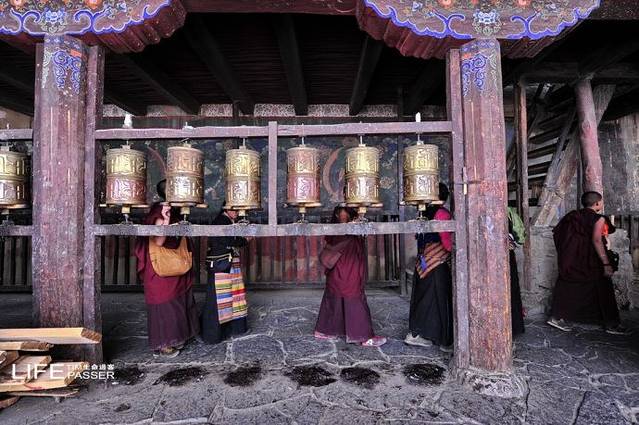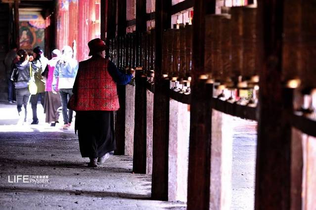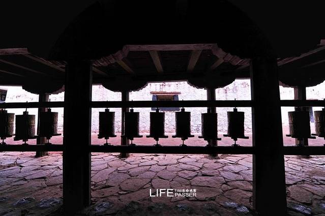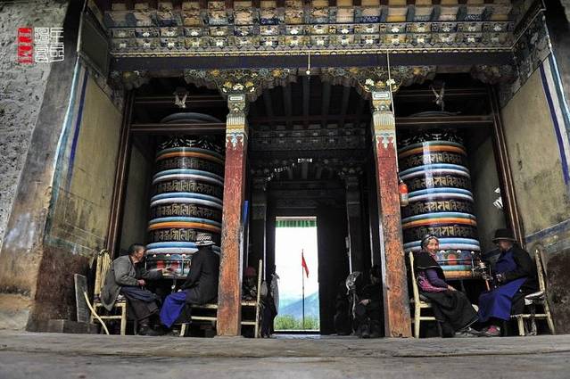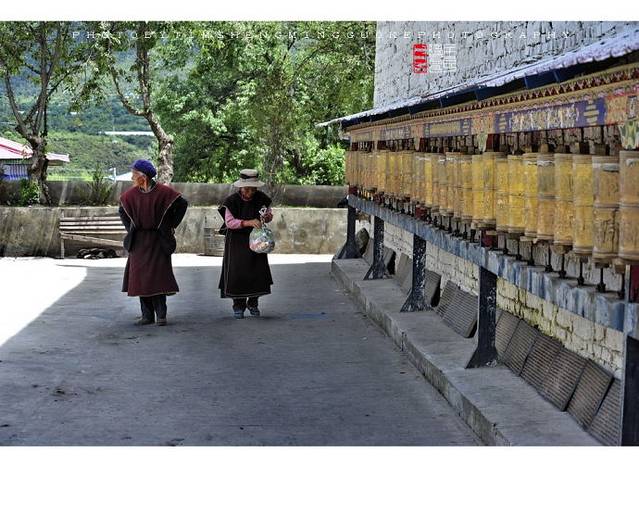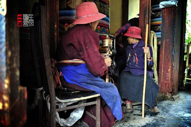 寺庙的门廊下,是两座大转经筒,坐着好多藏族老阿妈在一心一意的转着经筒。
