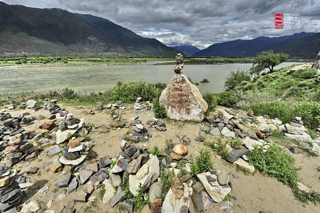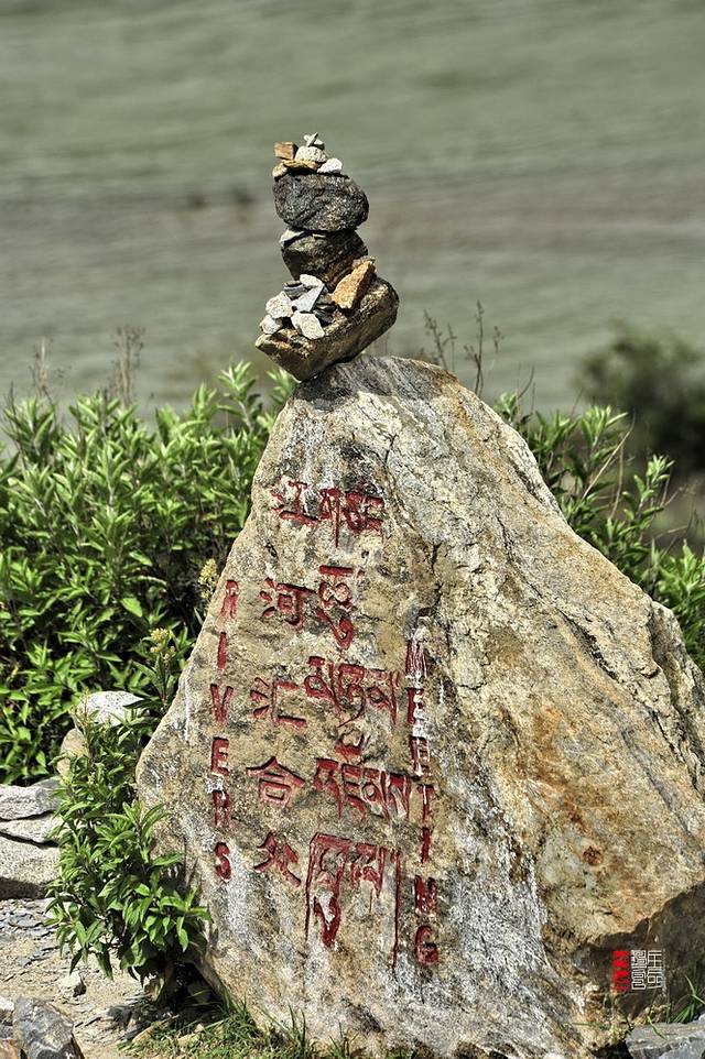 岸边高地上,竖着一块大石,上面用英汉藏文雕刻着“江河汇合处”。