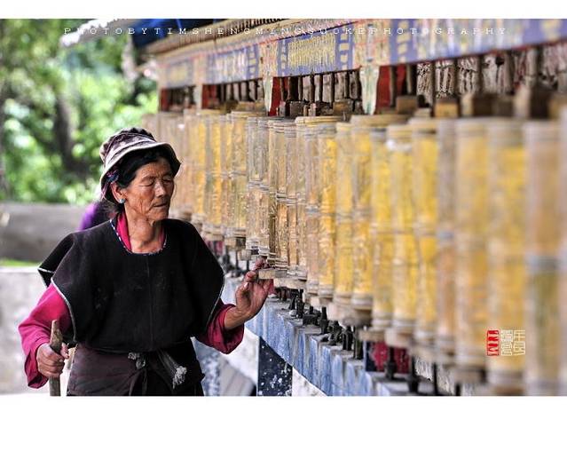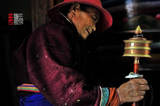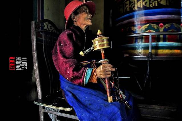 我蹲在老阿妈们的身边,静静的看她们在阴暗的门廊下转经。