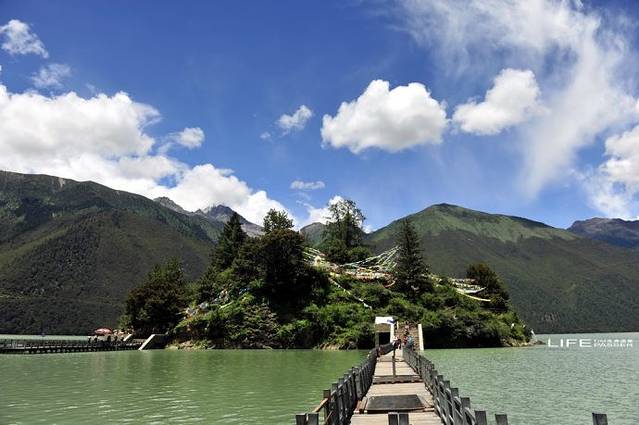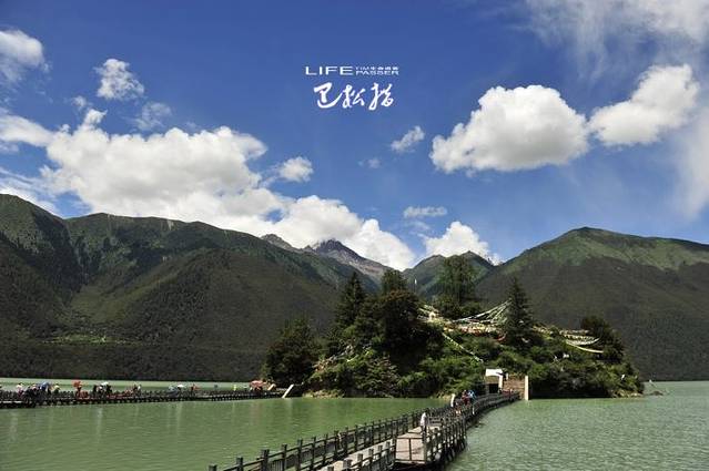 巴松措也叫措高湖,在藏语中意思为“绿色的水”,千万年前的地质运动而形成的堰塞湖,长约12公里,湖宽几百至数千米不等。最深处66多米。总面积为37.5平方公里。在初进巴松措不远处,有座湖心小岛扎西岛,距离岸边有百来米远,以前上岛需要划着小木船过去,现在已经建起了两座浮桥,方便了游人,也失去了划舟来往的天趣。扎西岛的神秘之处在于它的“空心岛”的传说,传说中,小岛与湖底并不相连,就这么悬浮湖面几千年。扎西岛上,有始建于十三世纪中叶的措宗工巴寺,措宗,藏语意为湖中城堡,是红教宁玛派寺庙。庙里供奉有莲花生大师,千手观音。