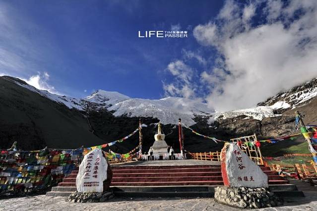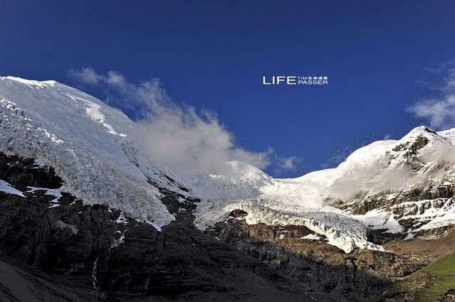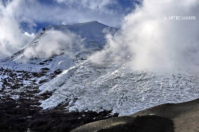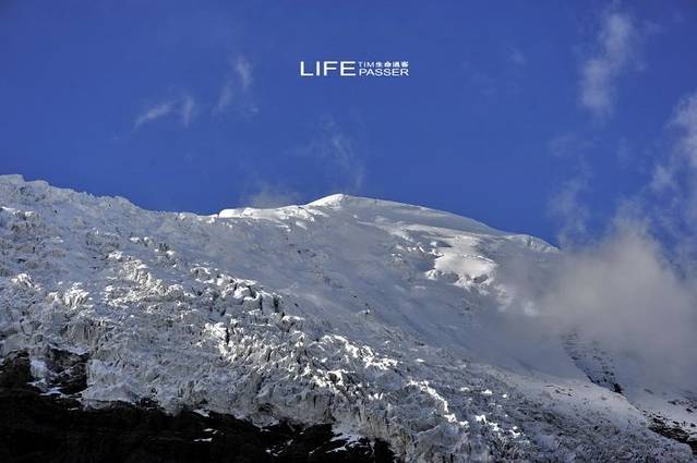 巨大的冰川从山顶云雾飘缈处,一直延伸到离公路只有几百米的路边,晶莹幽蓝中,捎来几许凉嗖嗖的感觉。虽然由于长年受公路上灰尘的影响,冰川整体呈黑白分层形态,但冰川上半部在阳光的照耀下,犹如一副巨型唐卡挂在山壁上,熠熠生辉。(资料来自网络收集)