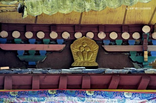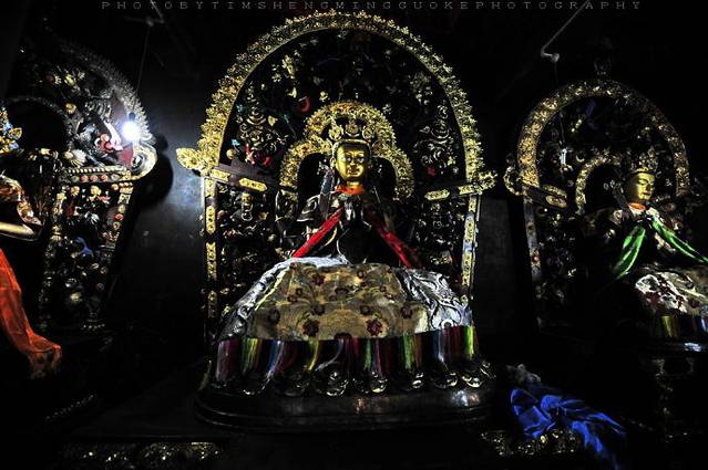 500多年历史的大殿里,立柱上挂满了年代久远的丝织唐卡佛像。