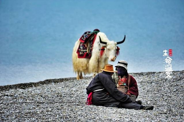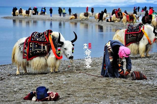 在湖边,坐着几位藏族妇女,手中提着个悬壶一样的物件,频频轻放水中又提起,循环往复。猜想应该是藏传佛教的某种仪式吧?