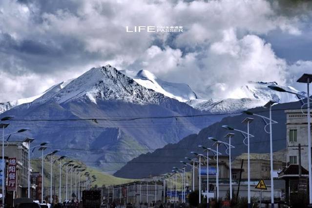 经过的小镇,道旁密密的太阳能路灯杆。远处的雪山,仍然静静的俯瞰着人世的生活。