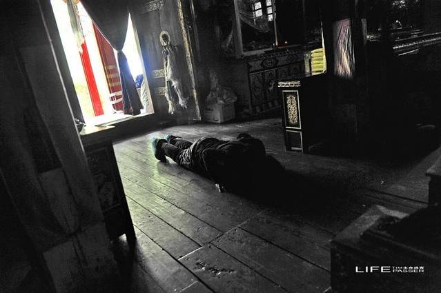 在昏暗的寺内,不停的有信徒进来匍匐跪拜、添油、放纸币。