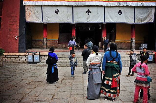 措钦大殿门前,已经有虔诚的藏民们三三两两聚集了。