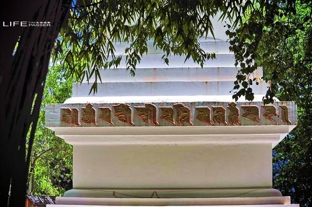 寺庙前,有座白塔。