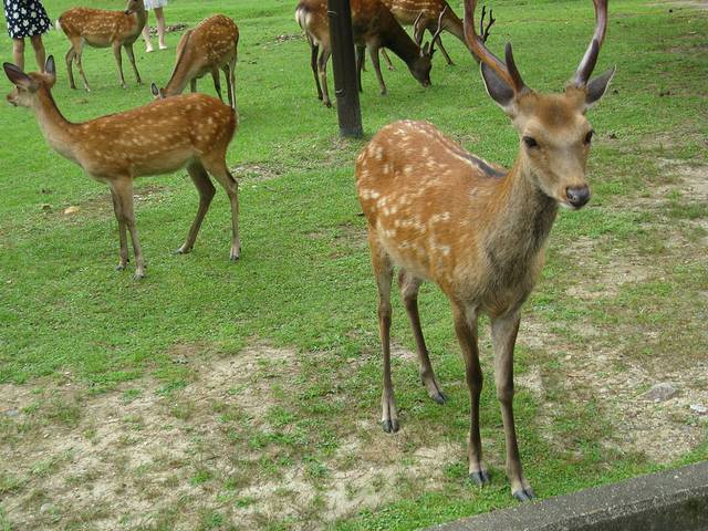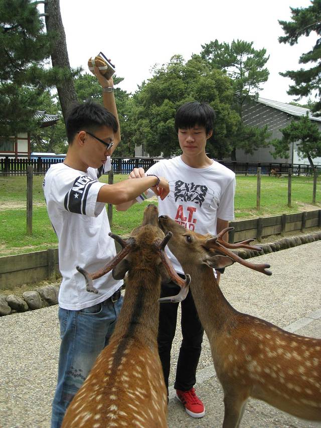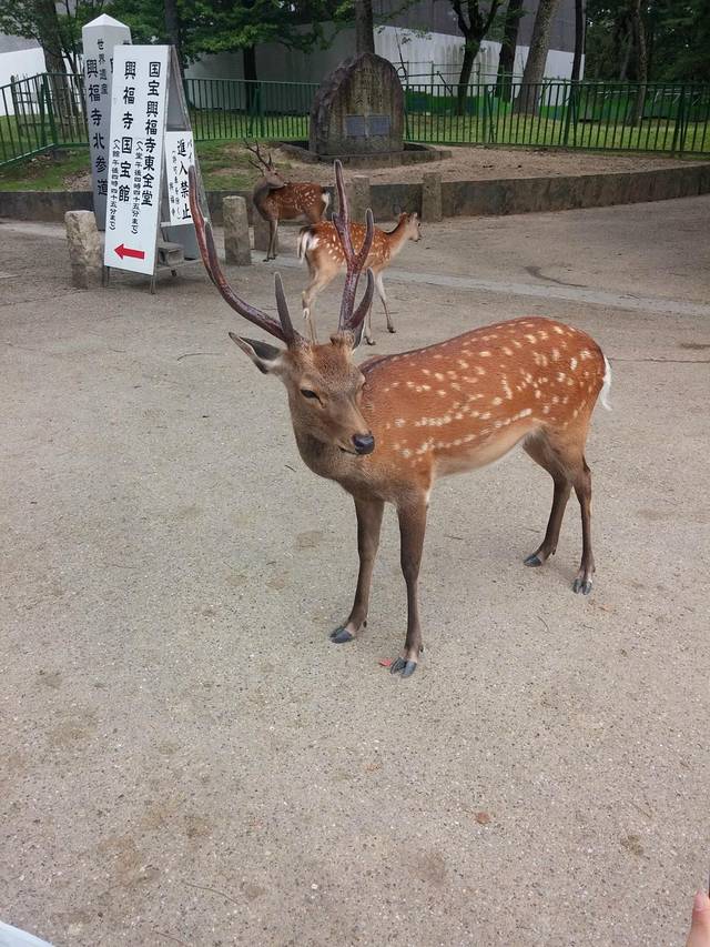 走路过来的的途中,发现两边车道中间的隔离带以及路口都竖着一个注意有鹿出没的牌子。难道鹿真的会跑到路中央乱窜?走到门口就看见一大群鹿在那边,完全不怕人的说!鹿超萌,他会不断冲向你的手。旁边就有卖鹿饼的地方可以试一下。就是他们的鼻子湿淋淋的,有点脏。