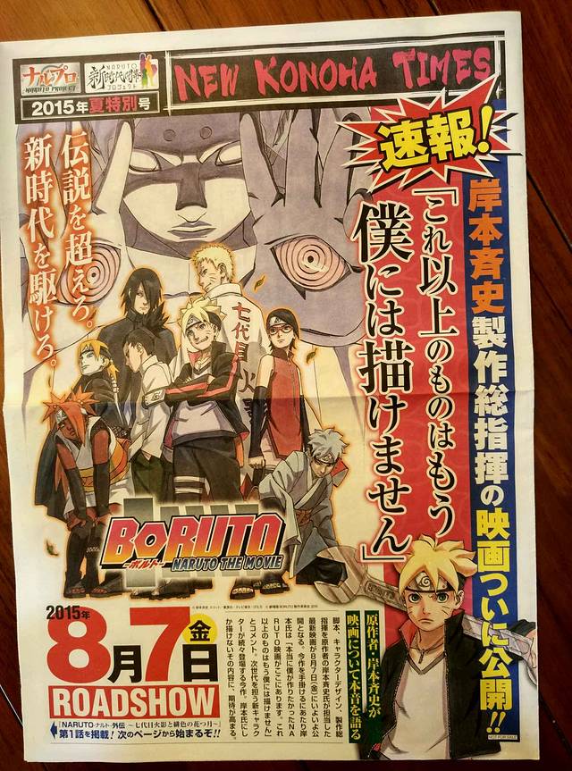 在电影院拿的BURUTO宣传报纸,里面不但有BORUTO的人物,故事介绍,还有AB画的两大页漫画。。。。很赞。。。。