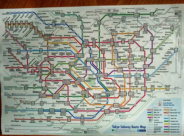 东京地下铁路线图。。。。感受下。。。而且最糟糕的还是分开几家公司(JR,都营,tokyo metro等等)同一地方,可能会有不同公司不同的进出口。然后有的地方,又只有这家去得了。。。。
