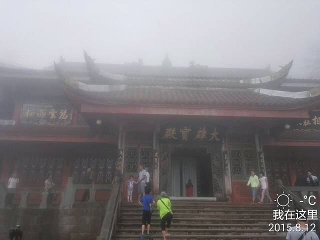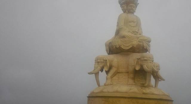我到山顶雾大,太阳时隐时不现,有时几乎看不见金身,什么舍身崖、金钢嘴,都是神仙,看不见身子,只能见脑袋。目前只开放金顶(千佛顶、万佛顶均未开放)。拜普贤菩萨、华藏寺、玉佛寺、大雄宝殿。