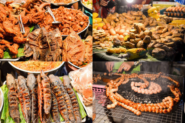 刚到清迈最想去的地方就是夜市,传说中的夜市好像有很多美食。第一晚到的时候找错了地方,去的是night bazzer,根本就不是美食夜市,是个卖东西的夜市。第二晚我们依然念念不忘夜市,还好在古城遇到了台湾大叔,他说泰国的夜市用泰语念叫“不读清迈”,我们就用这个名字问路,终于找到了。