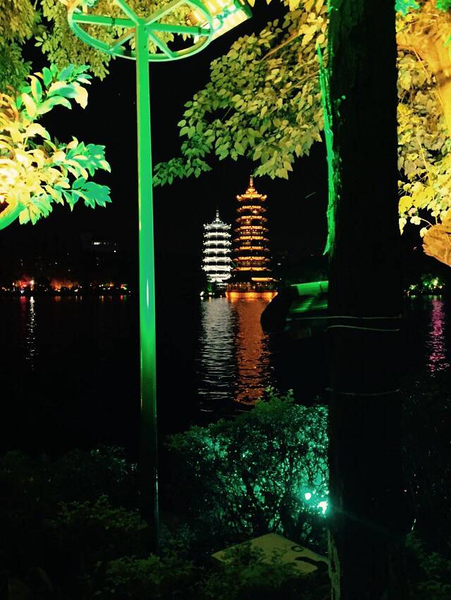第一天毕竟来到桂林了,好歹也要看看两江四湖的夜景吧,依旧是坐14路坐到中心广场附近,剩下的就是步行了,和其他城市一样,这里是桂林的商业中心,几乎所有的东西,在你所在的城市里都能买到,不过两江上的金银双塔还是比较不错的。