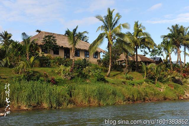 大约半个多小时后,河岸边椰林里的几栋草房映入我们的眼帘,导游告诉我们Rqiwaqa到了。