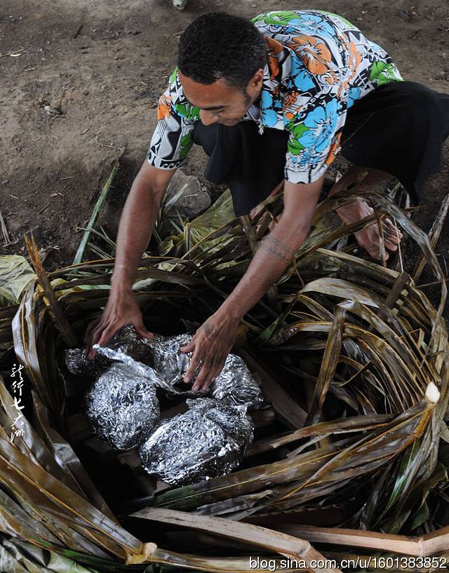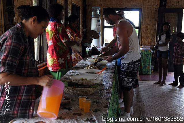 “卡瓦仪式”的整个过程是:先把清水注入盆中,盆中有Kava(一种当地的植物) 的根被包在毛巾中,主持仪式者在清水中揉搓毛巾,让Kava充分溶在水中,盆中的水变成了姜黄素,然后,再用毛巾把Kava水挤到碗里端给客人喝,整个仪式很简单但显得很隆重。当他们把Kava水端到我面前时,我真的很犹豫,不敢喝下去,但我看到所有的客人都喝了,我怕引起主人的不快,还是鼓足勇气喝了下去,没什么味道,有点像石膏水。