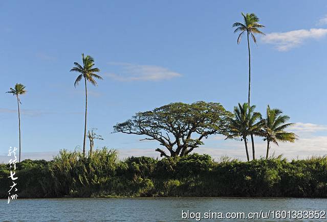 在Navua小镇的码头,换乘10人的小船后,逆流而上,向小村庄驶去。蓝天白云之下,河水清澈见底,两岸椰林摇曳,一片葱绿,时而还会看到山间的飞瀑,这一切让我感到目不暇接,沉醉在“美”中!