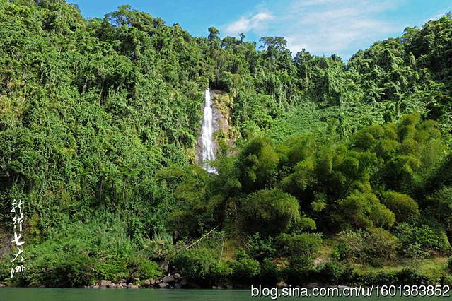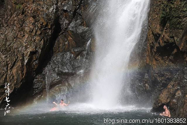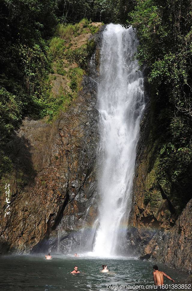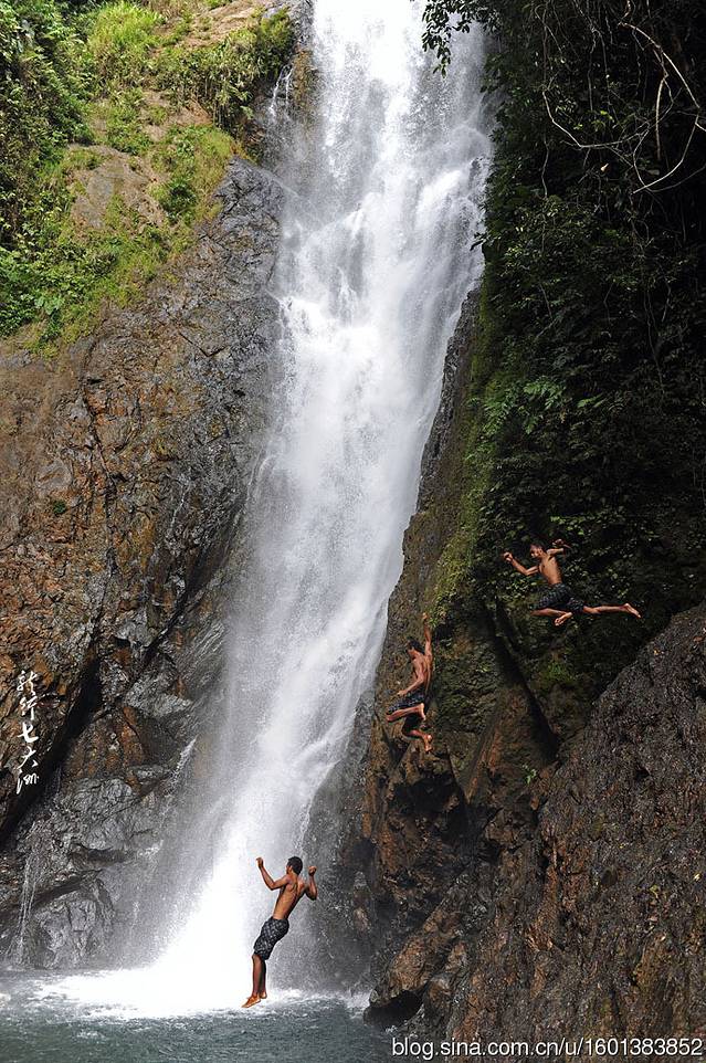 我们离开村庄,继续乘船去上游,去看Navua河上最大的瀑布。瀑布并不高,瀑布下的水潭很清澈,大多数客人都跳下去游泳了,我是旱鸭子,只能给他们拍照。那个导游居然爬上瀑布旁的山坡往下跳,我抓了个连拍接片。