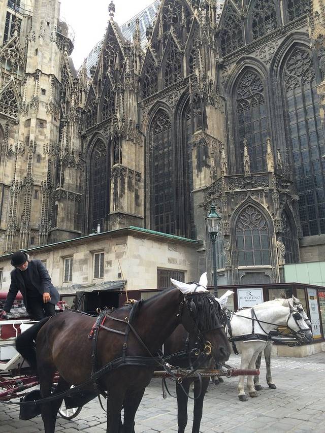 随后去了市中心的史蒂芬大教堂和黑死病纪念柱,也是维也纳的购物街,地铁U1或U3 Stephandom站。教堂下面有一家维也纳品牌的威化饼干Manner,粉色的,那家店大概是旗舰店的样子,有很多周边产品和吃的,但是我买完了回了德国发现德国更便宜= =教堂旁边还有马车可以坐,马耳朵上还戴了帽子像兔几一样可爱。