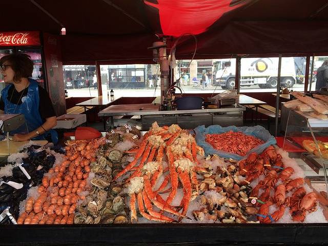 早上去了central station,旁边是市政厅,市政厅也可以进去参观。之后坐车奔赴机场,13:10的飞机飞卑尔根,14:35到。从卑尔根机场出来坐机场大巴到老城市中心fish markt。这里海产品很新鲜,也很贵,我们买了一盘fish and chips149克朗,不过超级好吃。