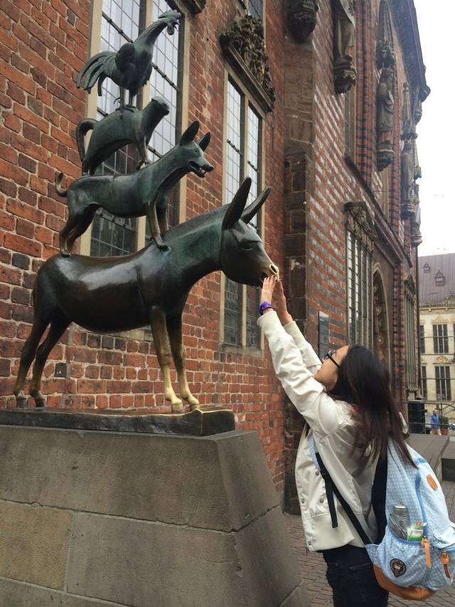 市政厅后面教堂的街角就是众所周知的令人期待的城市音乐家雕塑= =就是那个有名的德国童话里面的四个主人公,猫、狗、鸡和驴。真的很不起眼的雕塑一眨眼就会错过。于是这个城市的游览就结束了。