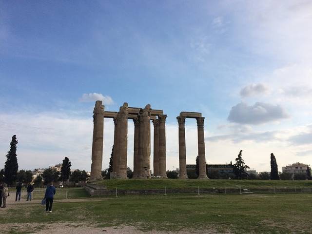 从卫城下来我们去了奥林匹亚宙斯神庙,这个要单独收费,但是学生证还是免费= =几根巨大的典型雅典式柱子在一片草地中央,周围也是现代的马路,路边开满一树树花朵,阳光又很充足。难怪希腊人这样慵懒,守着祖先留下来的东西发展旅游业吃老本就够了= =