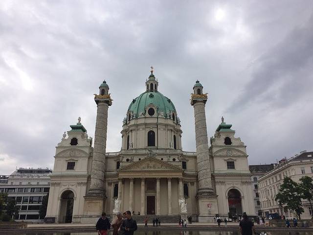 然后坐地铁去了南边的查理教堂,U2Karlplatz站。据说傍晚有人在教堂前面水池前空地跳广场舞= =门票学生三欧多,卖票的小哥看到我的帽子又十分激动说你不用拿学生证,我相信你,我也喜欢拜仁。。坐个电梯可以上到教堂顶,然后还需要走一段楼梯,不过不是开放的观景台,室内的,还都是铁栅栏拦着。