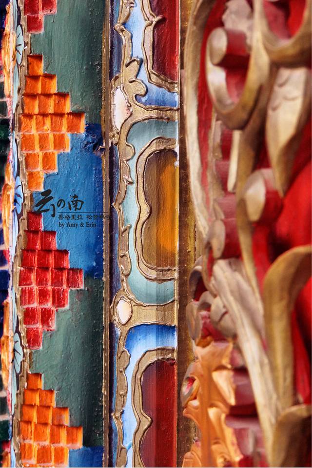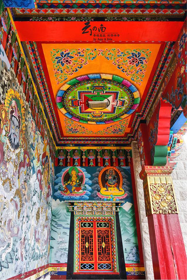 进门的天花板,花纹和用色都很浓重,典型的藏族风格,看起来就像是一块巨大的唐卡。